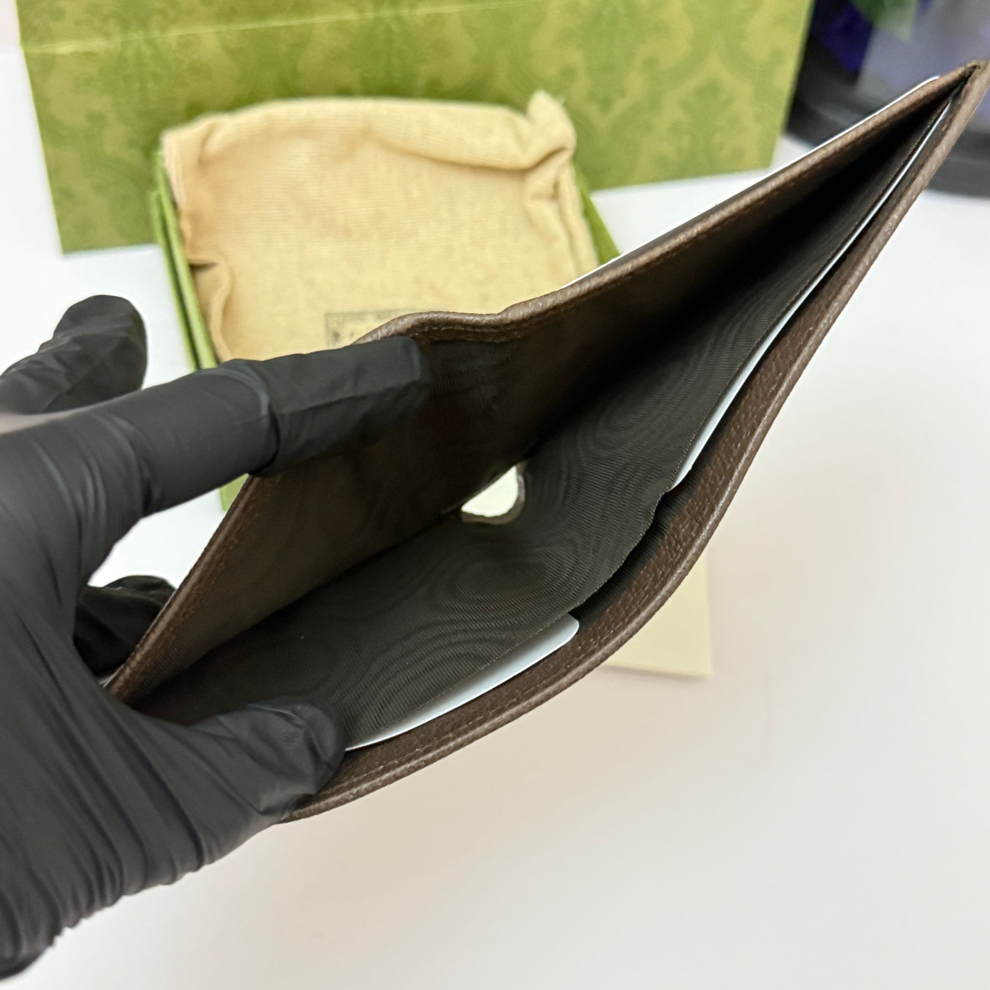 Bi-fold wallet in camel and ebony Jumbo GG canvas with brown leather trims. It features two bill compartments and eight card slots.