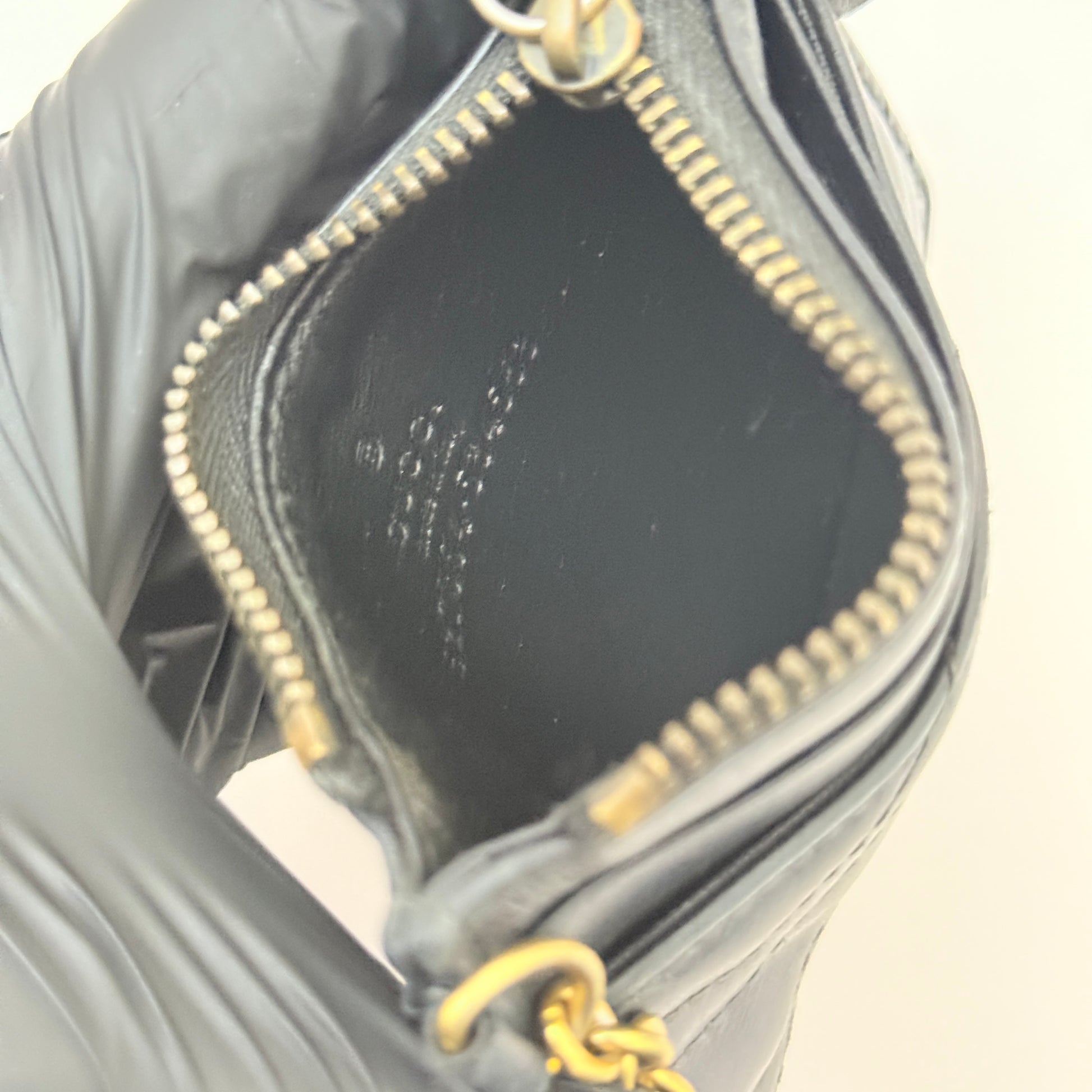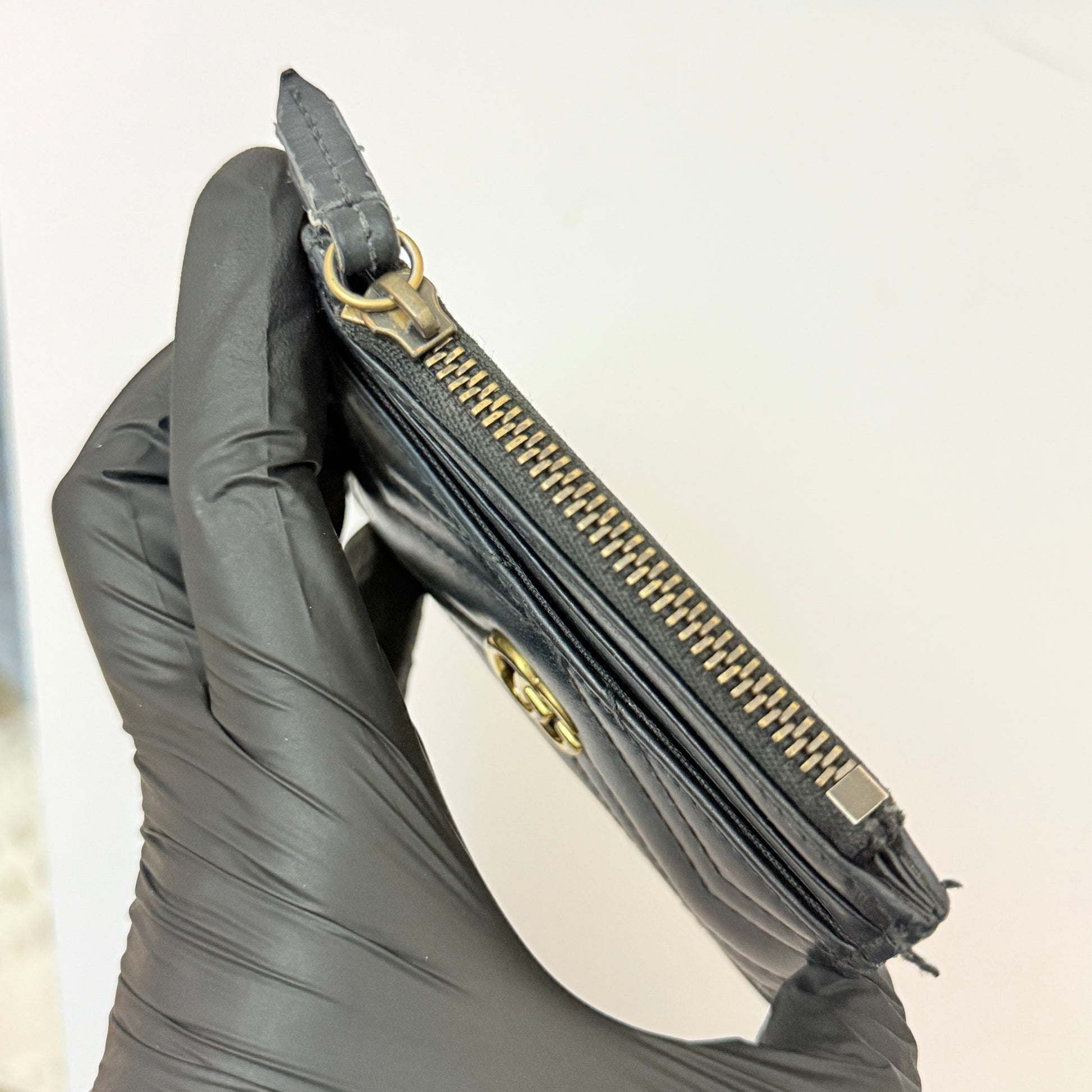 A slim design with zipper pocket, the GG Marmont wallet is designed with a chain and hook that allows it to be attached to a larger bag or carry keys. Crafted from the collection's distinctive matelassé chevron leather in black, the shape is finished with a small Double G in gold-toned metal. Black matelassé chevron leather, Antique gold-toned hardware Double G, Chain with hook, Interior: 4 card slots and 1 zipped coin pocket, 4"W x 3"H x .4"D, Made in Italy